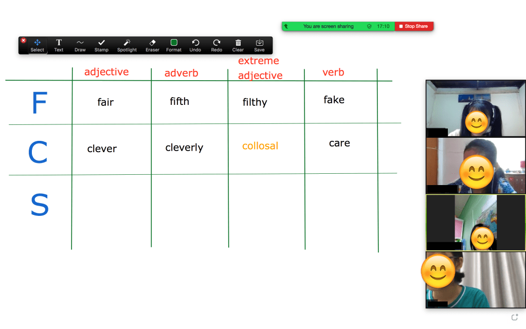 This is a classic game and it always goes down well in class but I was a little worried about taking it into my online classes. Usually with stop the buss I get my students to work in teams but that format just doesn’t work well in a Zoom call so for online I get them to work on their own. To play ask the students to draw a table in their books (you can demonstrate this on the whiteboard function on Zoom) with enough room for five or six categories. These can be anything you want, for example; you could use the categories adjective, adverb, extreme adjective, verb, conjunction for a lesson on story telling. When the students have finished drawing their table explain to them that you are going to give them a letter and they must think of a word for each category that begins with that letter. The first student to complete the table should shout “stop the bus!” Check their answers, if they are all correct then they are the winner and you can play again with a different letter. If they have got any of the categories wrong then let the rest of the class keep working until someone completes the table.